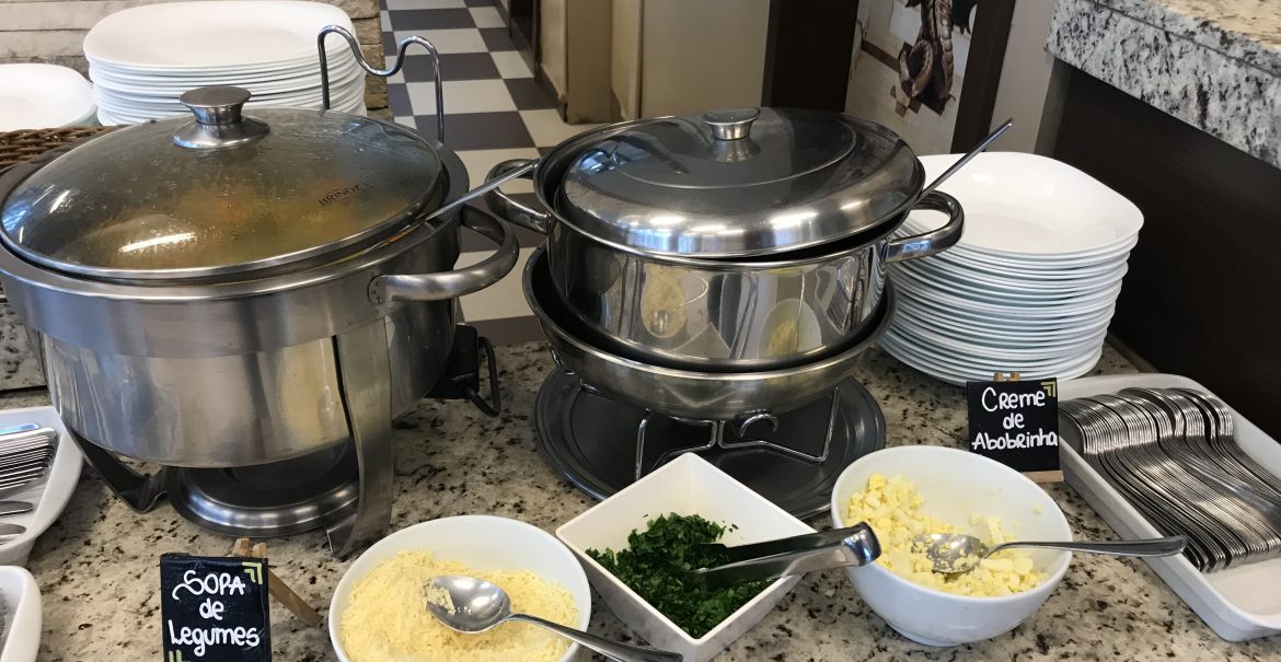 O bufê é variado e existe além dele, uma ilha de massas, boas sobremesas e duas opções de sopa.