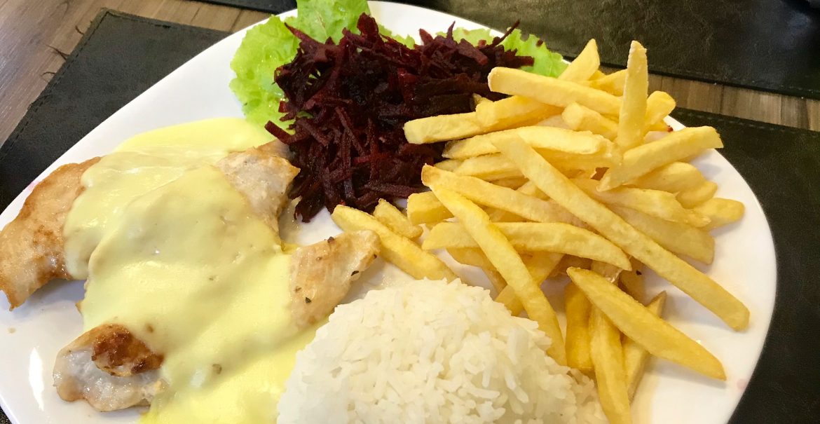 Uma padaria que oferece almoço com duas opções de prato a preços convidativos.