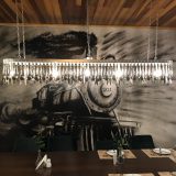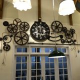 Outras atrações são o relógio estilizado e a mesa compartilhada que é tem um lustre decorado com talheres.