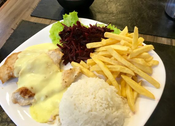 Uma padaria que oferece almoço com duas opções de prato a preços convidativos.