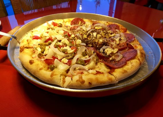 Um lugar bacana com decoração temática que oferece pizza em sistema a lá carte com massa e